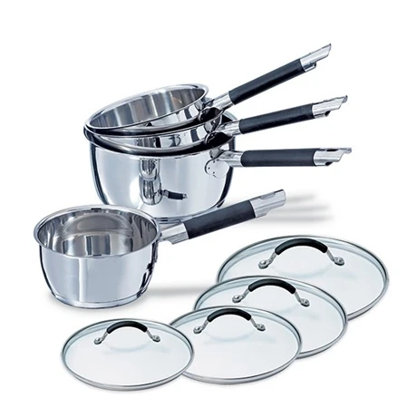 – 4 casseroles d’une capacité de 0,9 – 1,25 – 2 et 2,8 litres et de diamètres 14, 16, 18 et 20.