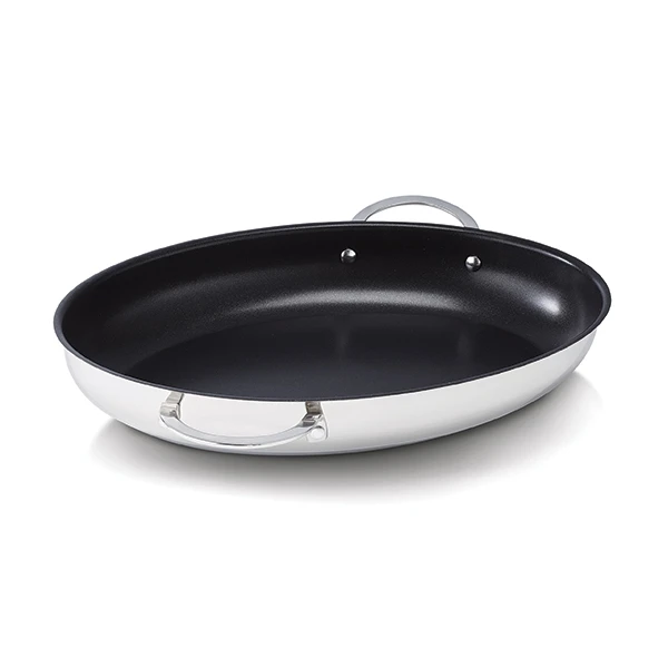 Créée par l’enseigne mondialement reconnu Beka, cette poêle à poisson ovale 37,2 x 25 cm a été conçue dans les matériaux les plus performants : grâce à son acier inoxydable 18/10, la diffusion de la chaleur est optimisée pour un meilleur rendement, une cuisson plus rapide et homogène. Son revêtement Dualforce 3 couches renforcé de céramique vous garantira des performances de qualité professionnelle. Designé pour une utilisation optimale, la poêle à poisson Beka est dotée des dimensions idéales et d’une forme ovale afin de pouvoir y faire cuire vos poissons entiers sans problème, à chair grasse ou fine. Vous pourrez également y faire frire des légumes ou des brochettes de viande.