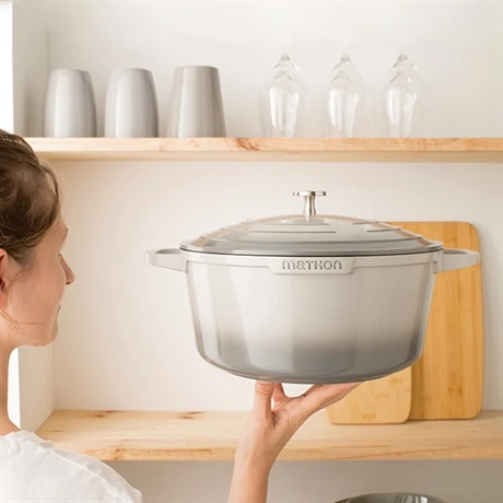 Combinant les avantages de la cuisson lente d’une cocotte traditionnelle en fonte de fer et la légèreté de la fonte d’aluminium, cette cocotte est 3 fois plus légère que les cocottes traditionnelles. Pratique, cette cocotte est également esthétique et passe sans problème du four à la table ; son aspect extérieur rouge mat et son intérieur noir profond font d’elle un bel objet à présenter à vos convives.