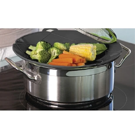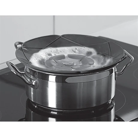 La Protection anti-débordement est un couvercle anti-éclaboussures qui évite également les projections lors de la cuisson des aliments. Malin, une fois posé sur une casserole d’eau bouillante, ce couvercle qui possède des pétales intérieures qui laissent passer la vapeur, fait retomber l’ébullition des liquides et les empêche de s’écouler hors de la casserole. Il suffit ensuite de baisser le feu, en toute sécurité.