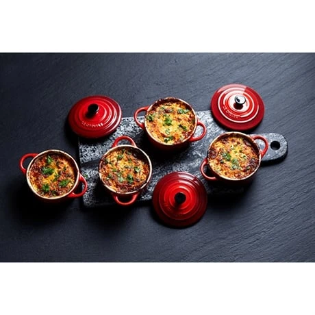 Pour servir entrées, accompagnements, desserts ou encore sauces, ce set 4 mini-cocottes céramique 10 cm Cerise est esthétique et traditionnel. Conçu en céramique d’exception par l’entreprise Le Creuset, il se distingue par sa polyvalence.